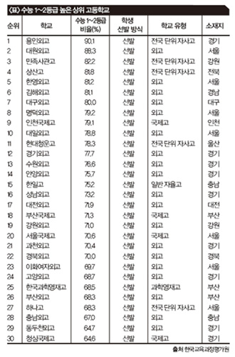 »óÀ§ 1% ÇлýµéÀÇ ºÐÆ÷µµ¸¦ ºÐ¼®ÇÑ °á°ú, ÀϹݰí¿Í °ø¸³Çб³´Â ¾à¼¼¸¦ º¸ÀÎ ¹Ý¸é, ±¹Á¦°í¿Í ¿Ü°í, Àü±¹ ´ÜÀ§ ÀÚ»ç°í, ¿µÀçÇб³ µîÀÌ °¼¼¸¦ ³ªÅ¸³½ °ÍÀ¸·Î ³ªÅ¸³µ´Ù.