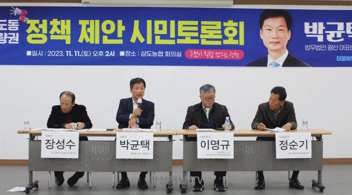 ¹ÎÁÖ´ç ÀÌÀç¸í ´ëÇ¥ ¹ý·üƯº¸ÀÎ ¡¸¹ý¹«¹ýÀÎ ±¤»ê¡¹ ¹Ú±ÕÅà º¯È£»ç´Â 11. 11.(Åä) ¿ÀÈÄ 2½Ã ±¤ÁÖ »ïµµ³óÇù ȸÀǽǿ¡¼ »ïµµ‧º»·®±Ç ÁֹΠµî°ú ÇÔ²² Á¤Ã¥ Á¦¾È¡¤Åä·Ðȸ¸¦ ¿°í, ±¤ÁÖÇü ÀÏÀÚ¸® ¿Ï¼ºÀ» À§ÇÑ Àü¿ë ÁÖ°Å´ÜÁö Á¶¼º ¹æ¾È¿¡ ´ëÇÏ¿© ±íÀÌ ÀÖ´Â ³íÀǸ¦ Çß´Ù. ¹Ú º¯È£»çÀÇ ¹ßÁ¦·Î ½ÃÀÛÇÑ À̳¯ Åä·Ðȸ´Â À强¼ö Àü ±¤Áֽà µµ½Ãöµµ°Ç¼³º»ºÎÀåÀÌ »çȸÀÚ, À̸í±Ô ±¤ÁÖ´ëÇб³ ±³¼ö(Àü ±¤ÁÖµµ½Ã°èȹÀ§¿øÈ¸ ºÎÀ§¿øÀå), Á¤¼ø±â Àü º»·®ÁÖ¹ÎÀÚÄ¡À§¿øÈ¸ À§¿øÀå µîÀÌ ÁöÁ¤Åä·ÐÀÚ·Î ³ª¼¹À¸¸ç, ¾à 80¸íÀÇ ÁÖ¹ÎÀÌ Âü¿©ÇÏ¿© ÀǰßÀ» ±³È¯Çß´Ù.