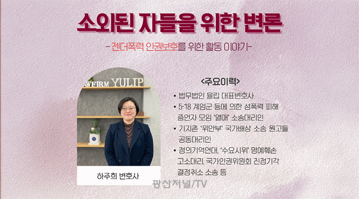 ¿©¼ºÆø·ÂÃß¹æÁÖ°£(11¿ù 25ÀÏ~12¿ù 1ÀÏ)À» ¸Â¾Æ ¿¸®´Â À̹ø Ư°¿¡¼´Â ÇÏÁÖÈñ ¹ý¹«¹ýÀÎ À²¸³ ´ëÇ¥º¯È£»ç°¡ ¡®¼Ò¿ÜµÈ ÀÚµéÀ» À§ÇÑ º¯·Ð¡¯À» ÁÖÁ¦·Î Á¨´õÆø·Â À뱂 º¸È£¸¦ À§ÇÑ ¿©·¯ Ȱµ¿¿¡ °üÇØ À̾߱⸦ ³ª´«´Ù.