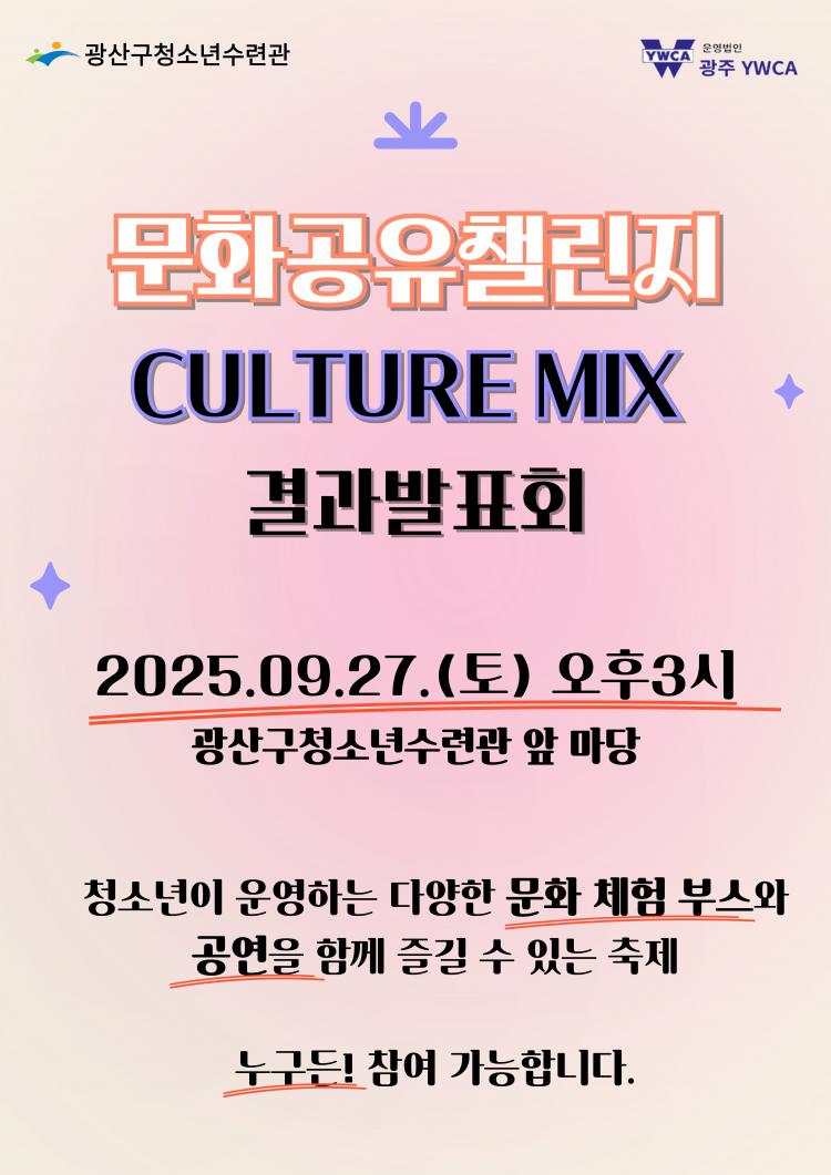 [±¤»êÀú³Î] ±¤»ê±¸Ã»¼Ò³â¼ö·Ã°ü(±è½Å¿µ °üÀå)Àº ¿À´Â 9¿ù 27ÀÏ(Åä) ¿ÀÈÄ 3½Ã, ¼ö·Ã°ü ¾Õ¸¶´ç¿¡¼ ¡®2025³â ¹®È°øÀ¯Ã§¸°Áö CULTURE MIX °á°ú¹ßǥȸ¡¯¸¦ °³ÃÖÇÑ´Ù.